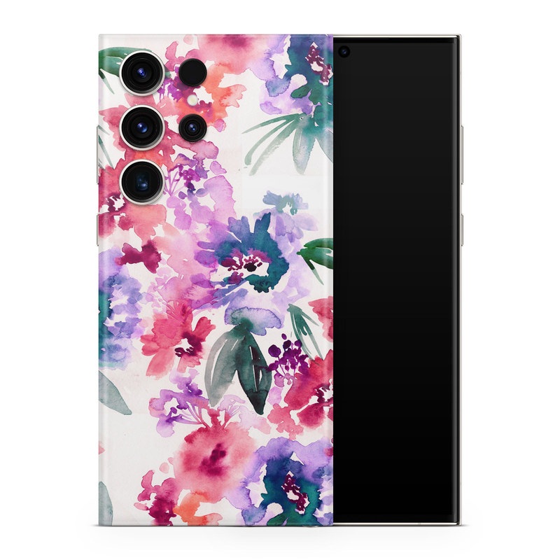 iStyles Samsung Galaxy S23 Series Skin design of Purple, Pattern, Pink, Lilac, Violet, Flower, Watercolor paint, Floral design, Plant, Design, with green, pink, red, purple, white colors, and tagged with flowers, patterns, bloom, blooms, floral, florals, sara, saraberrenson, watercolor.