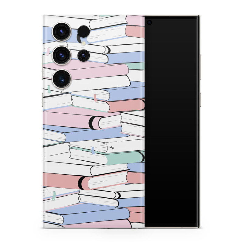 iStyles Samsung Galaxy S23 Series Skin design of White, Line, Material property, Red, Font, Pattern, Parallel, Carmine, Rectangle, Slope, with white, black, blue, green, pink colors, and tagged with objects, patterns, books, stack, background.
