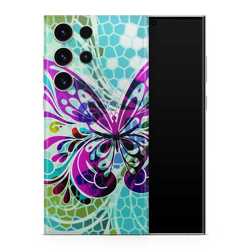 iStyles Samsung Galaxy S23 Series Skin design of Butterfly, Pattern, Insect, Moths and butterflies, Purple, Graphic design, Design, Pollinator, Visual arts, Magenta, with blue, green, purple colors, and tagged with patterns, animals.