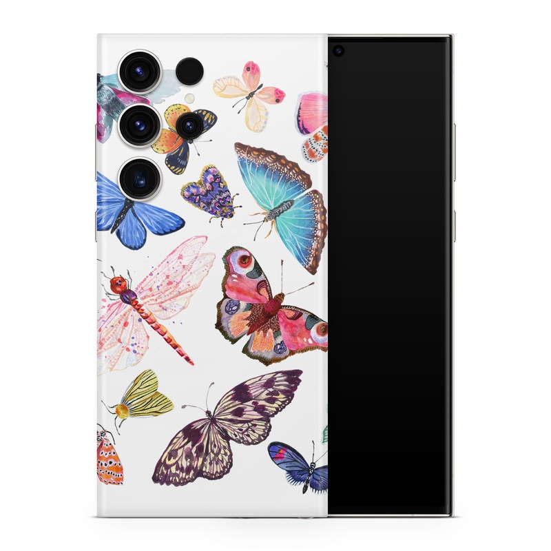 iStyles Samsung Galaxy S23 Series Skin design of Butterfly, Pollinator, Insect, Arthropod, Organism, Moths and butterflies, Art, Symmetry, Wing, Illustration, with white, blue, green, red, yellow, orange, pink, brown, purple colors, and tagged with patterns, animals, bug, butterflies, butterfly, drawing, insects, nature, outdoors, watercolor.