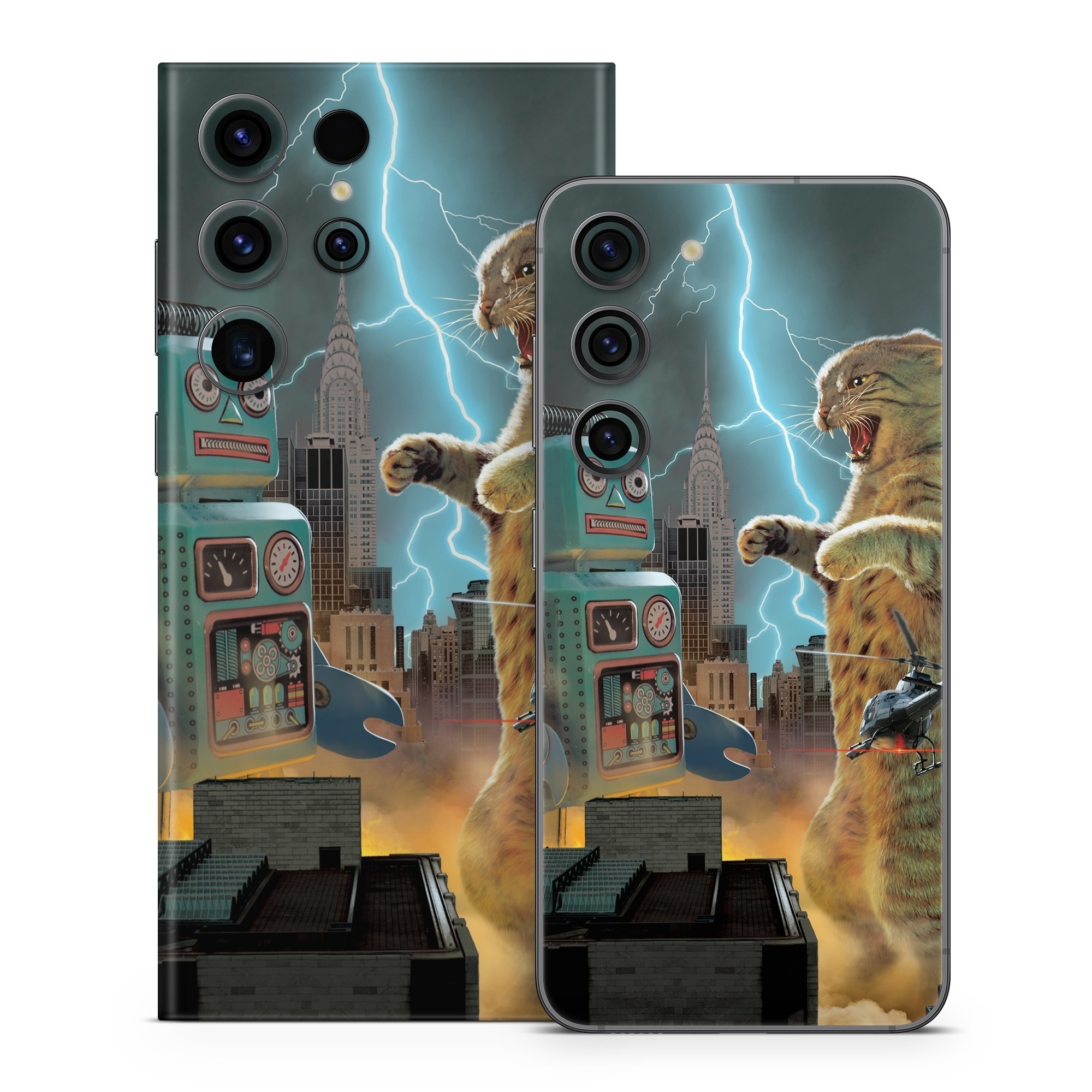 iStyles Samsung Galaxy S23 Series Skin design of Lightning, Felidae, Carnivore, Art, Whiskers, Big cats, Cg artwork, Terrestrial animal, Small to medium-sized cats, Thunder, with black, blue, red, yellow, white, brown, gray, orange colors, and tagged with animals, fantasy, objects, urban, cat, robot, fight, lightning, helicopter.