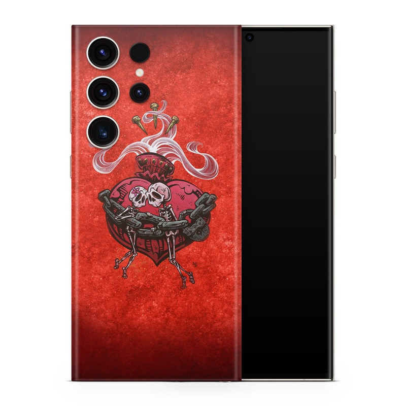 iStyles Samsung Galaxy S23 Series Skin design of Orange, Art, Font, Sleeve, Tints and shades, Symbol, Pattern, Logo, Magenta, Graphics, with black, red, white, gray colors, and tagged with skulls, hearts, flowers, objects, forever, together.