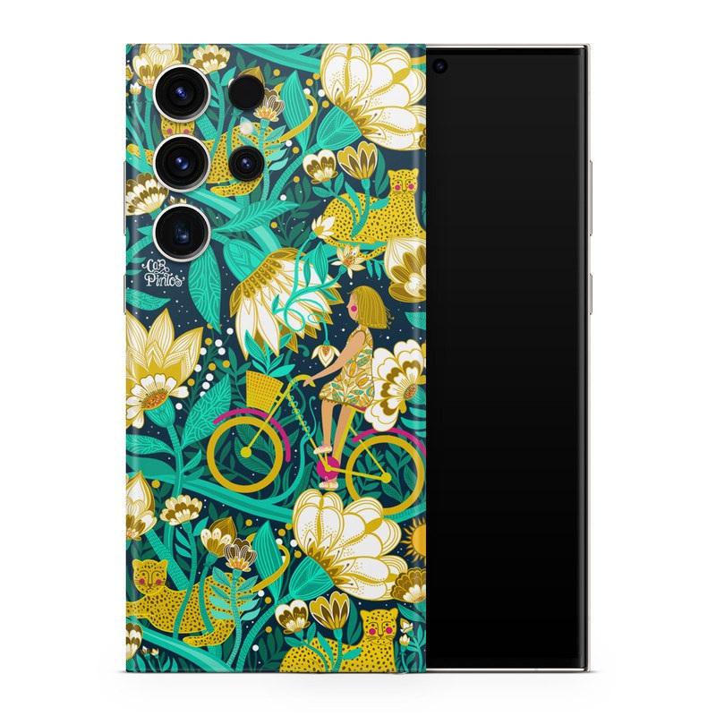 iStyles Samsung Galaxy S23 Series Skin design of Green, Rectangle, Plant, Aqua, Pattern, Electric blue, Art, Motif, Design, Visual arts, with green, black, blue, yellow, pink, white, red, brown colors, and tagged with patterns, flowers, animals, objects, people, cheetah, girl, bicycle, flowers, sun, stars, sky.