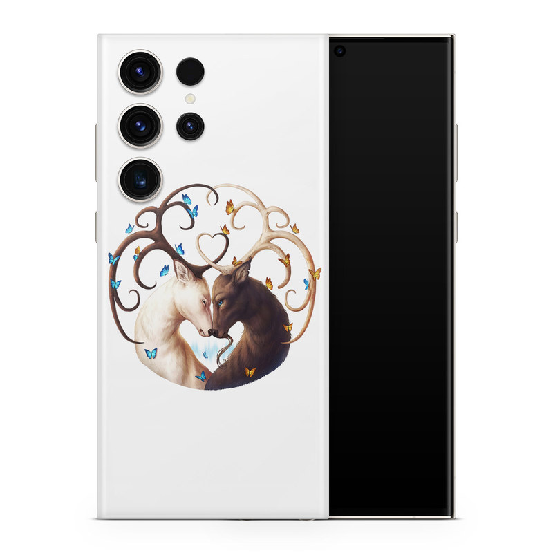 iStyles Samsung Galaxy S23 Series Skin design of Gesture, Fawn, Serveware, Horn, Font, Art, Mythical creature, Dishware, Tail, Drinkware, with white, brown, blue, yellow, orange colors, and tagged with animals, signs, antlers, butterflies, deer, yinyang.