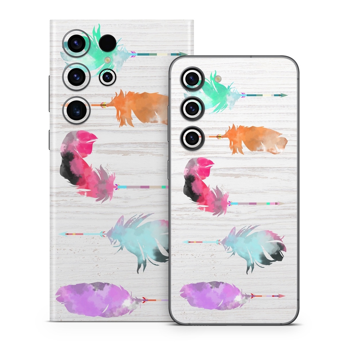 iStyles Samsung Galaxy S23 Series Skin design of Pink, Watercolor paint, Illustration, Feather, Design, Art, Painting, Graphic design, Visual arts, Drawing, with white, orange, red, blue, pink, purple, green colors, and tagged with patterns, objects.