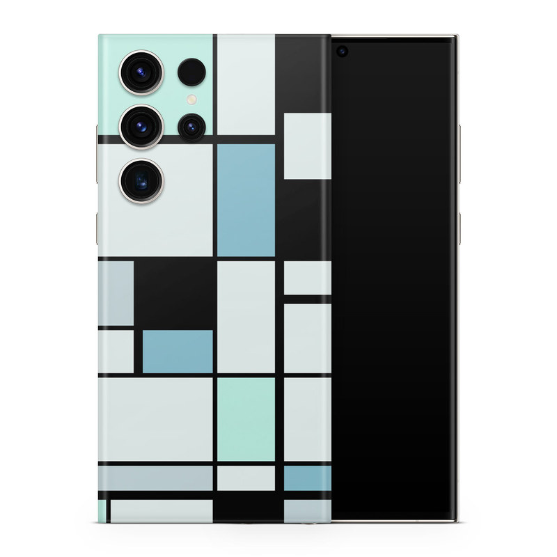 iStyles Samsung Galaxy S23 Series Skin design of Blue, Line, Turquoise, Pattern, Rectangle, Design, Parallel, Square, Symmetry, Tints and shades, with black, blue, green colors, and tagged with patterns, blocks, blue, cool, geometry, lines.