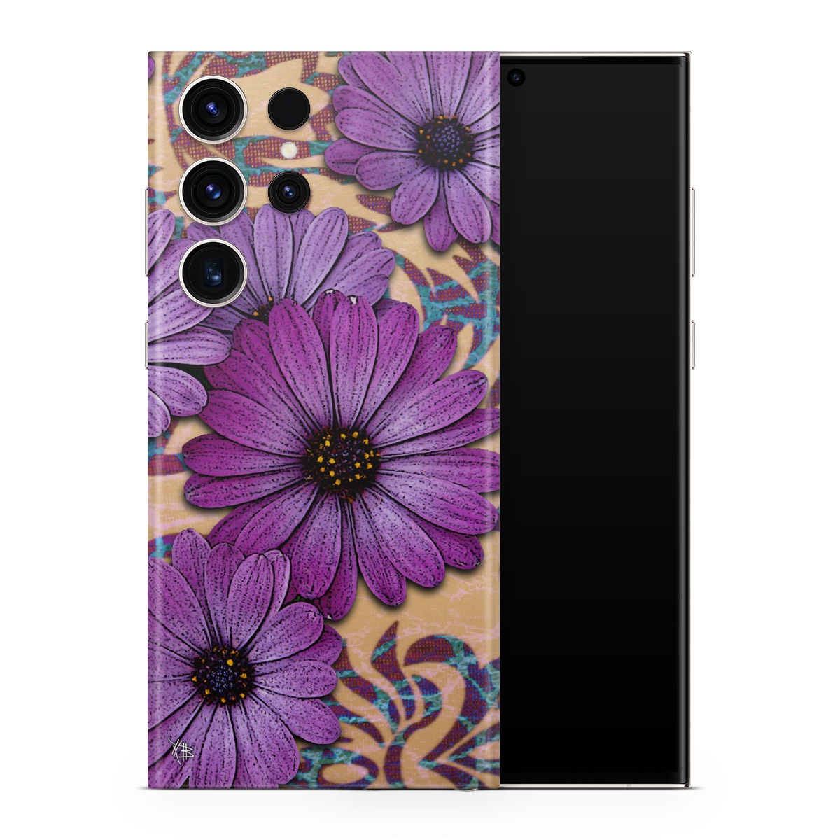 iStyles Samsung Galaxy S23 Series Skin design of Purple, Flower, Violet, Petal, Plant, african daisy, Floral design, Wildflower, Pattern, Textile, with purple, black, gray, blue, green, red colors, and tagged with flowers, patterns.