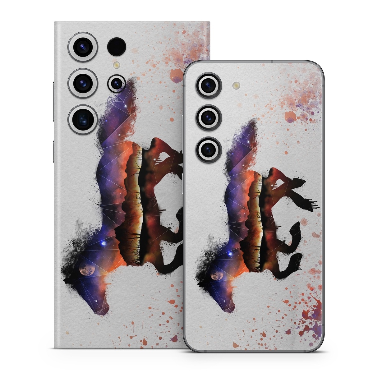 iStyles Samsung Galaxy S23 Series Skin design of Watercolor paint, Illustration, Art, Horse, Paint, Drawing, Graphic design, Painting, Visual arts, Mustang horse, with gray, white, purple, red, yellow, black, orange colors, and tagged with animals, nature, space, animals, horse, moon, nature, night, stars, watercolor.