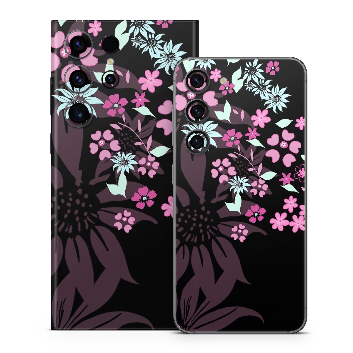 iStyles Samsung Galaxy S23 Series Skin design of Pink, Pattern, Flower, Plant, Botany, Petal, Floral design, Design, Pedicel, Graphic design, with black, gray, purple, green, red, pink colors, and tagged with flowers, abstract, patterns.