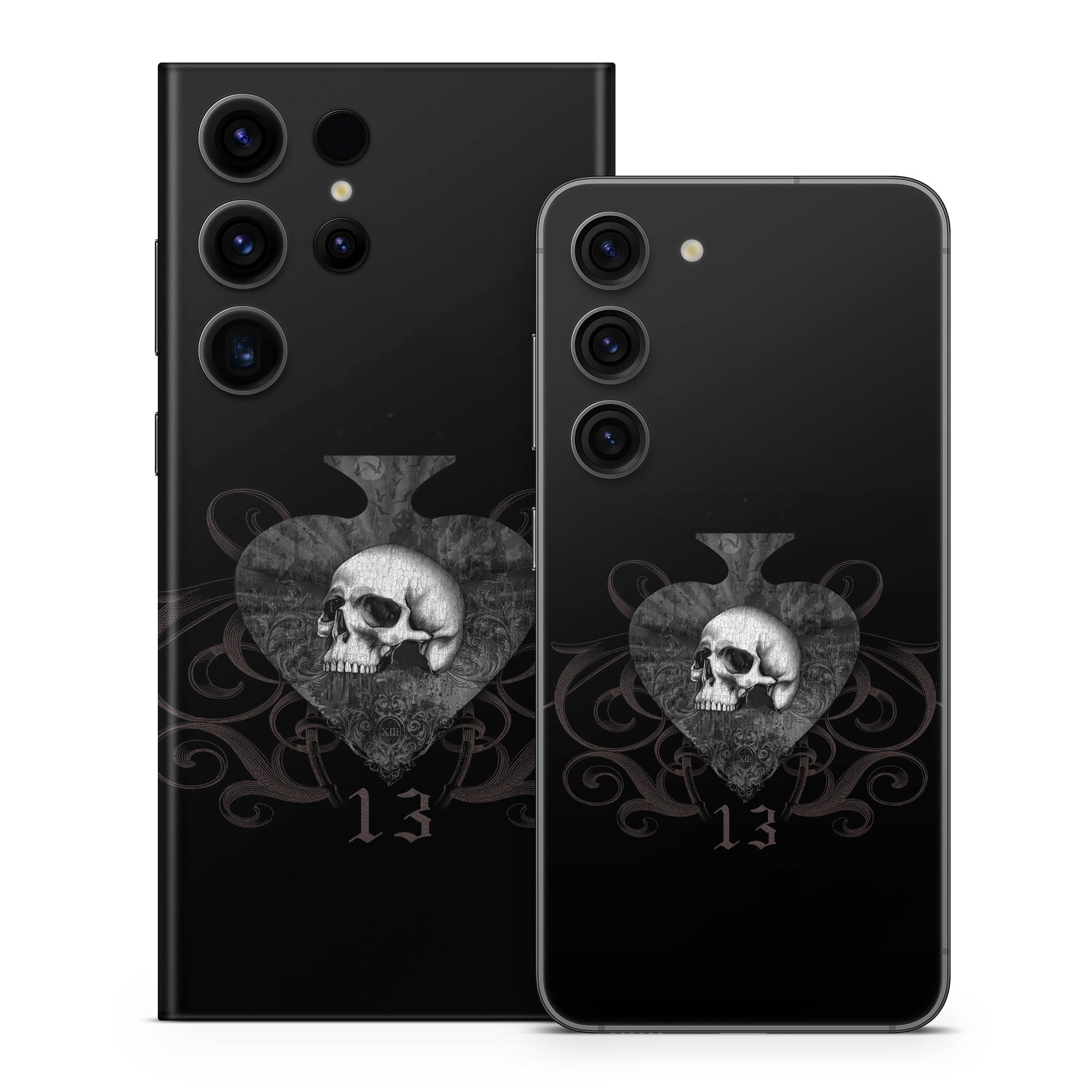 iStyles Samsung Galaxy S23 Series Skin design of Bone, Jaw, Grey, Art, Skull, Font, Darkness, Monochrome photography, Illustration, Monochrome, with black, white, brown colors, and tagged with skulls, signs, patterns, fantasy, skull, thirteen, spade.
