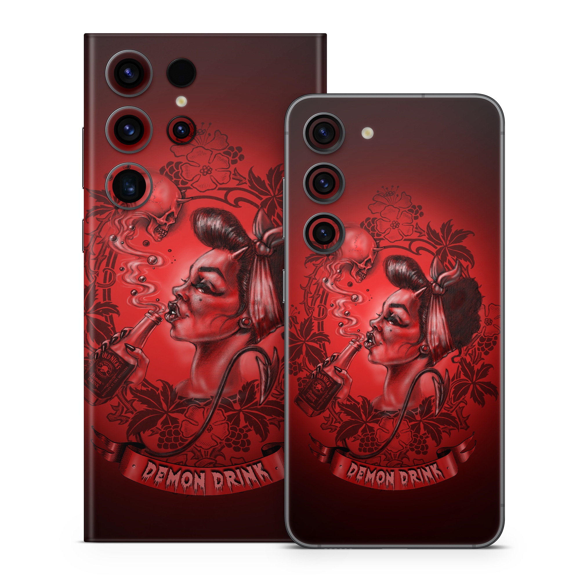iStyles Samsung Galaxy S23 Series Skin design of Font, Art, Magenta, Pattern, Graphics, Visual arts, Painting, Carmine, Illustration, Drawing, with black, red, white colors, and tagged with skulls, signs, people, objects, fantasy, addiction, alcohol, bottle.