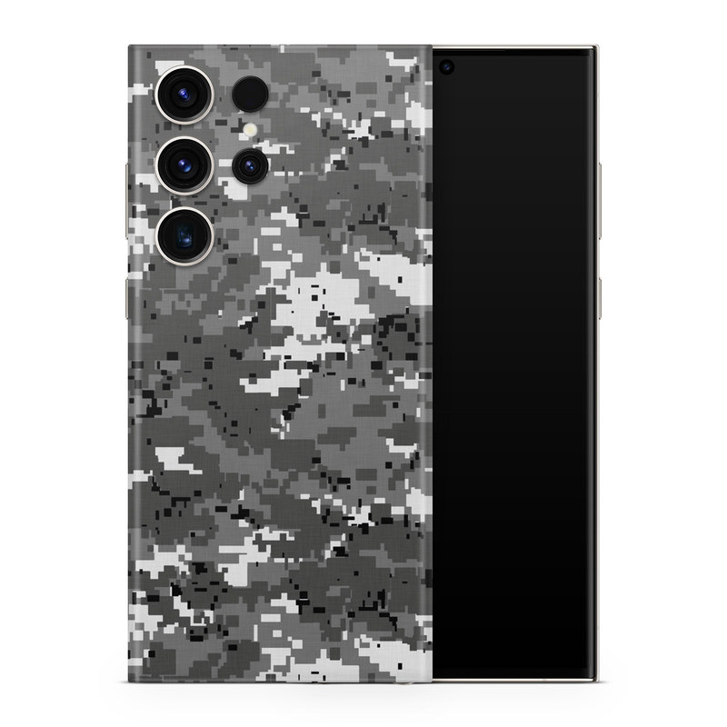 iStyles Samsung Galaxy S23 Series Skin design of Military camouflage, Pattern, Camouflage, Design, Uniform, Metal, Black-and-white, with black, gray colors, and tagged with military, lookslike, patterns.