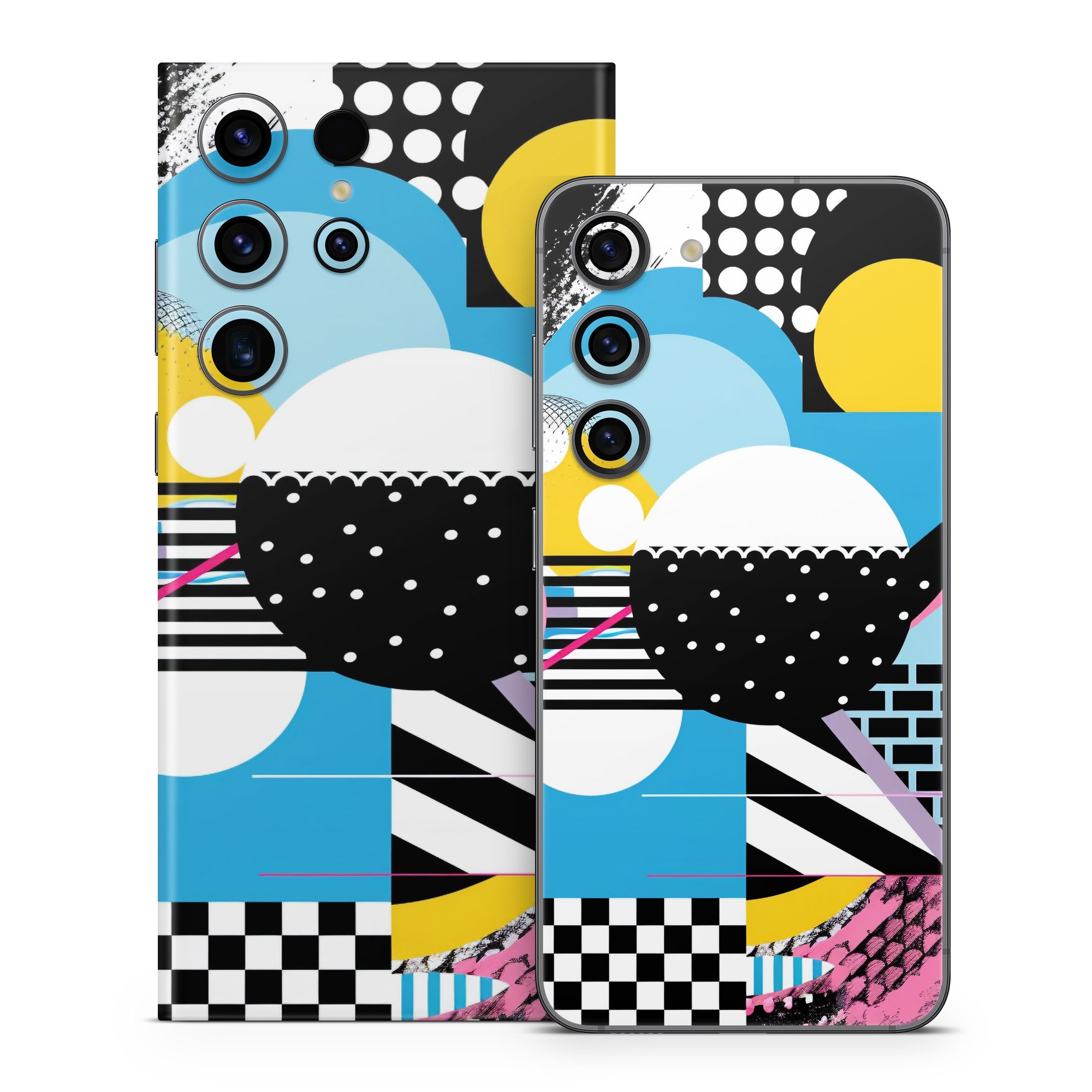 iStyles Samsung Galaxy S23 Series Skin design of White, Yellow, Art, Font, Pattern, Circle, Design, Creative arts, Graphics, Electric blue, with blue, pink, white, black, yellow colors, and tagged with abstract, abstract, checkered, bricks, circles, lines.