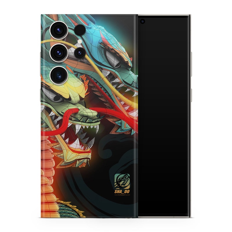 iStyles Samsung Galaxy S23 Series Skin design of Dragon, Fictional character, Illustration, Art, Cg artwork, Fiction, Mythical creature, Graphics, with black, green, red, yellow, orange colors, and tagged with animals, fantasy, blue, dragons, green, orange, tattoo.