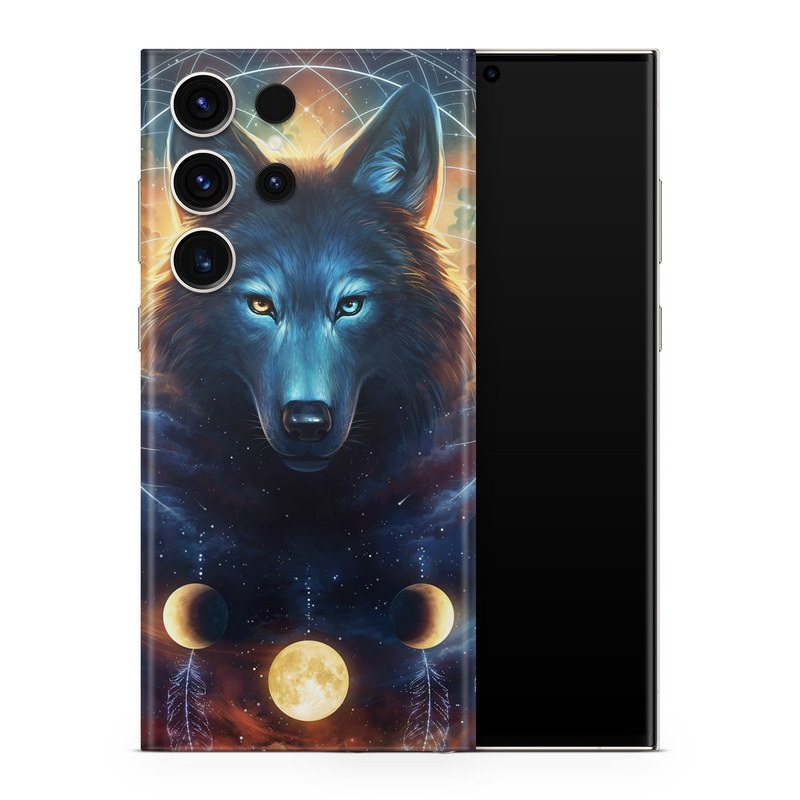 iStyles Samsung Galaxy S23 Series Skin design of Light, Nature, Carnivore, Organism, Dog breed, Art, Electric blue, Space, Midnight, Illustration, with black, blue, yellow, orange, green, red, white colors, and tagged with animals, signs, space, fantasy, blue, feathers, moon, sky, wolf, yellow.