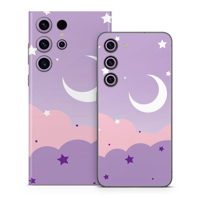 iStyles Samsung Galaxy S23 Series Skin design of Astronomical object, Pink, Star, Purple, Crescent, Moon, Graphics, Animation, Wallpaper, Graphic design, with purple, white colors, and tagged with space, patterns, night, stars, moon, clouds, sky.