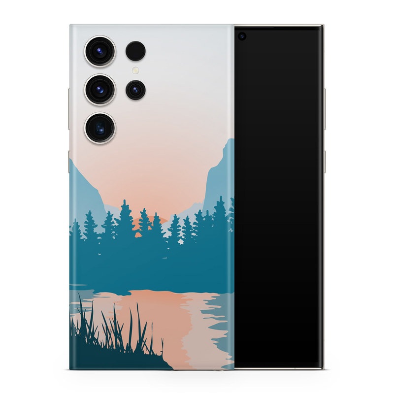 iStyles Samsung Galaxy S23 Series Skin design of Sky, Atmosphere, Mountain, Ecoregion, Plant, Natural landscape, Larch, Highland, Fog, Atmospheric phenomenon, with blue, yellow, orange, green colors, and tagged with nature, sunset, mountain, forest, landscape, grass.