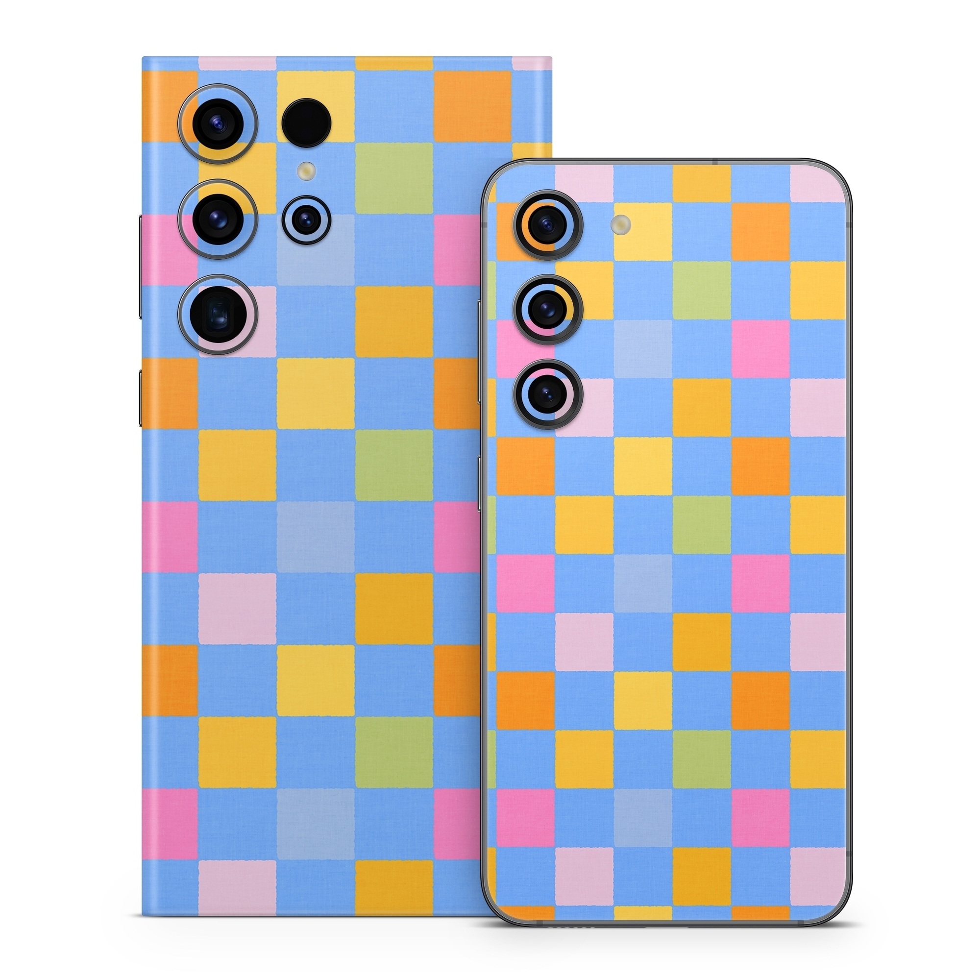 iStyles Samsung Galaxy S23 Series Skin design of Rectangle, Azure, Textile, Orange, Aqua, Font, Symmetry, Magenta, Tints and shades, Parallel, with blue, yellow, orange, green, pink colors, and tagged with patterns, checkered, squares, colorful.