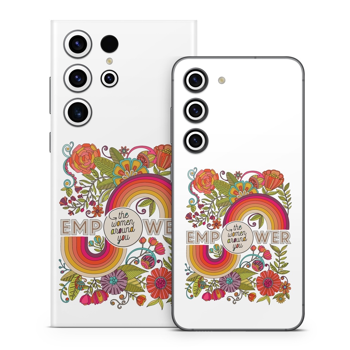 iStyles Samsung Galaxy S23 Series Skin design of Botany, Flower, Font, Creative arts, Petal, Circle, Pattern, Art, Visual arts, Floral design, with white, red, yellow, orange, green, blue colors, and tagged with flowers, signs, flowers, rainbow, empower, women, around, you.