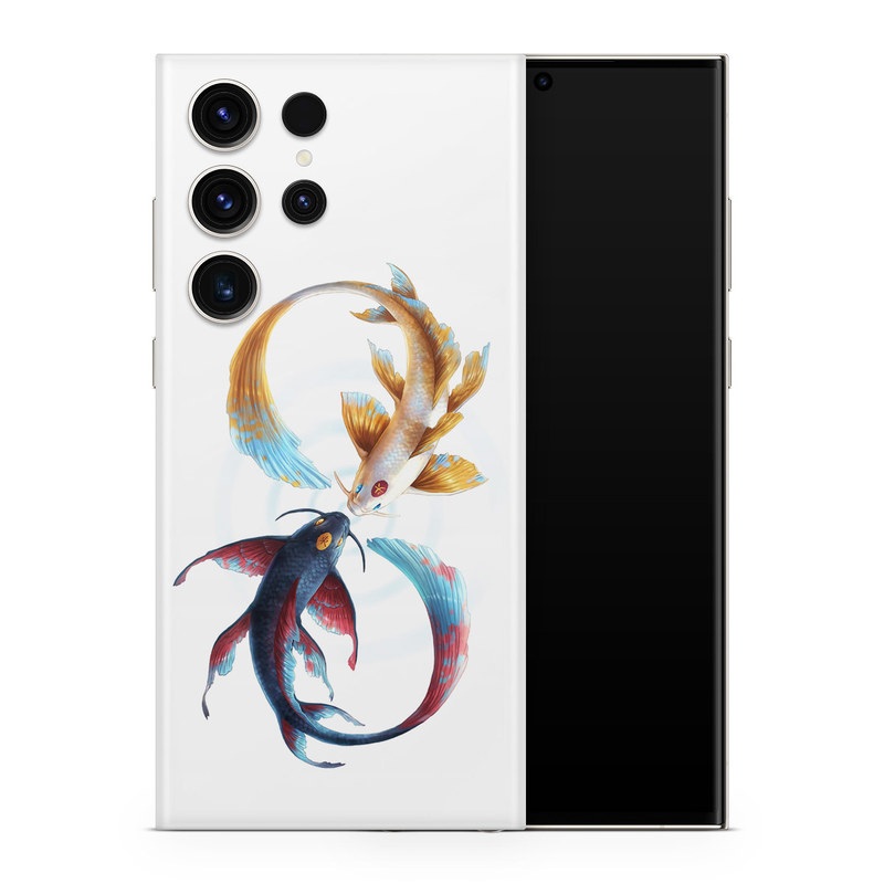 iStyles Samsung Galaxy S23 Series Skin design of Marine invertebrates, Art, Wing, Feather, Tree, Beak, Electric blue, Fish, Natural material, Painting, with white, black, yellow, orange, red, blue colors, and tagged with animals, signs, blue, fish, koi, red, yellow.