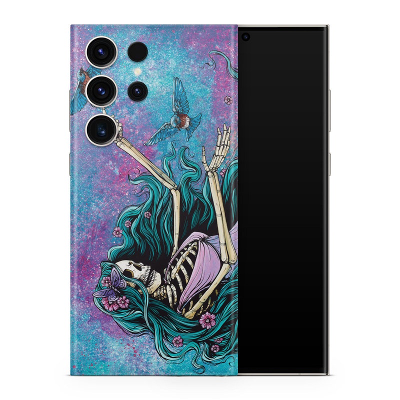 iStyles Samsung Galaxy S23 Series Skin design of Green, Purple, Painting, Paint, Art, Cg artwork, Mythical creature, Musical instrument, Graffiti, Artist, with blue, purple, white, gray, brown colors, and tagged with skulls, flowers, animals, blue, hair, purple, dress, beautiful, woman, girl, bird.