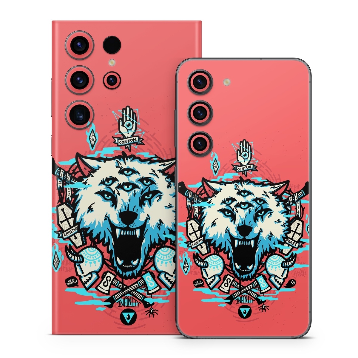 iStyles Samsung Galaxy S23 Series Skin design of Graphic design, Illustration, Crest, Logo, T-shirt, Symbol, Font, Graphics, Emblem, Pattern, with red, blue, black, gray colors, and tagged with animals, objects, signs.