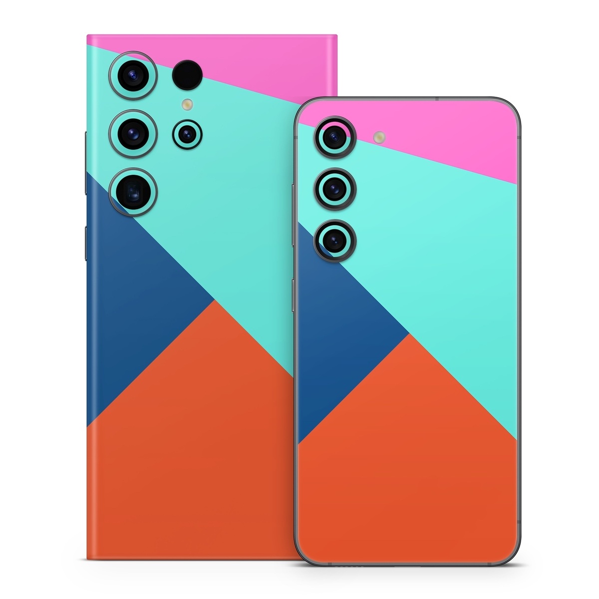 iStyles Samsung Galaxy S23 Series Skin design of Blue, Colorfulness, Turquoise, Line, Azure, Triangle, Pattern, Graphic design, Magenta, with blue, pink, orange, red colors, and tagged with patterns, block, blocking, color, colorblock, geometric, shape, simple.