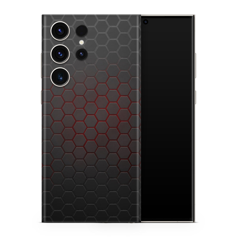 iStyles Samsung Galaxy S23 Series Skin design of Black, Pattern, Metal, Design, Mesh, Carbon, Space, Wallpaper, with black, red colors, and tagged with lookslike, fantasy, space, drones, geometric, hexagon, tech.