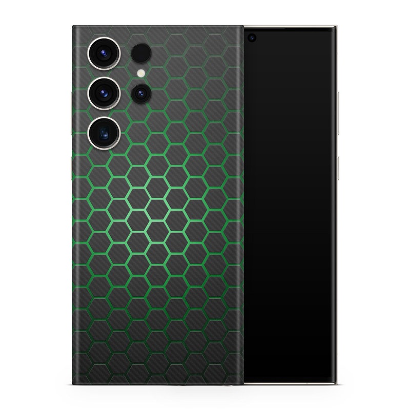 iStyles Samsung Galaxy S23 Series Skin design of Pattern, Metal, Design, Carbon, Space, Circle, with black, gray, green colors, and tagged with lookslike, space, fantasy, drones, geometric, hexagon, tech.