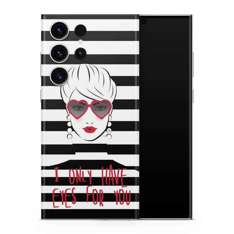 iStyles Samsung Galaxy S23 Series Skin design of Rectangle, Font, Gesture, Eyewear, Art, Technology, Personal protective equipment, Goggles, Logo, Eyelash, with black, white, yellow, red colors, and tagged with signs, objects, people, patterns, blackandwhite, girl, glasses, red, stripes, only, have, eyes, for, you.