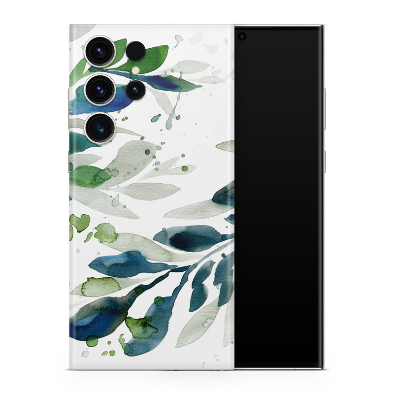 iStyles Samsung Galaxy S23 Series Skin design of Leaf, Branch, Plant, Tree, Botany, Flower, Design, Eucalyptus, Pattern, Watercolor paint, with white, blue, green, gray colors, and tagged with nature, blue, filigree, green, leaf, leaves, nature, outdoors, pastel, watercolor.
