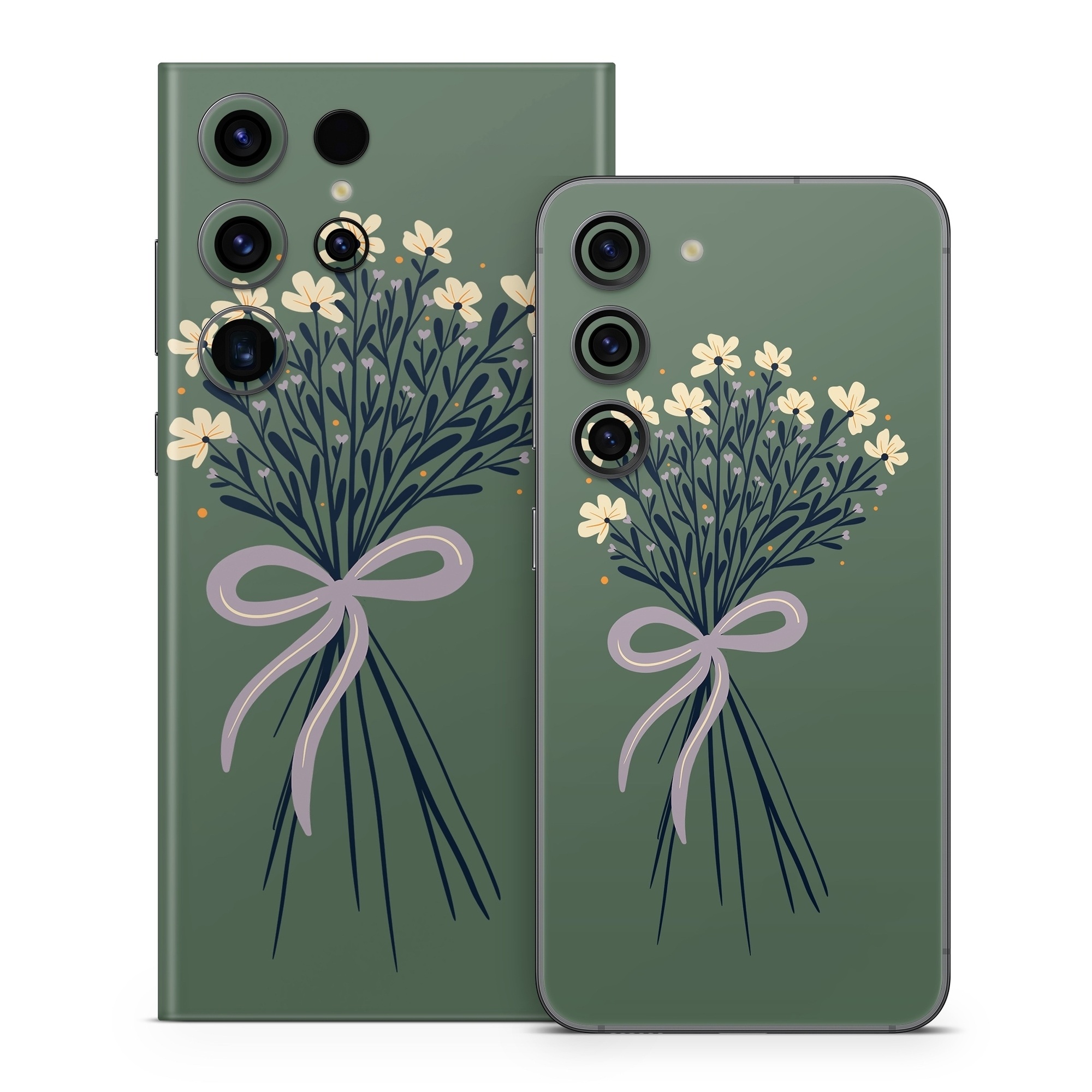 iStyles Samsung Galaxy S23 Series Skin design of Flower, Plant, Twig, Tree, Art, Pedicel, Flowering plant, Grass, Petal, Illustration, with green, yellow, white, purple colors, and tagged with flowers, bow, ribbon, bouquet.
