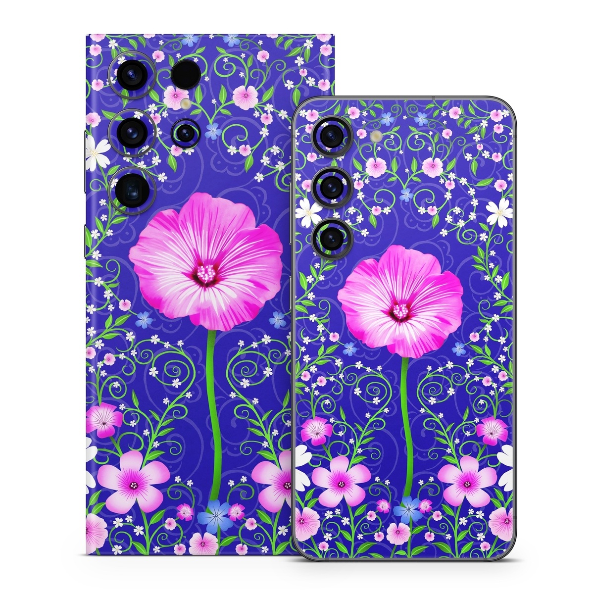 iStyles Samsung Galaxy S23 Series Skin design of Purple, Violet, Flower, Plant, Wildflower, Pattern, Petal, Design, Graphics, Morning glory, with blue, purple, pink, green, white, yellow colors, and tagged with flowers, patterns, floral, flowers, nature.