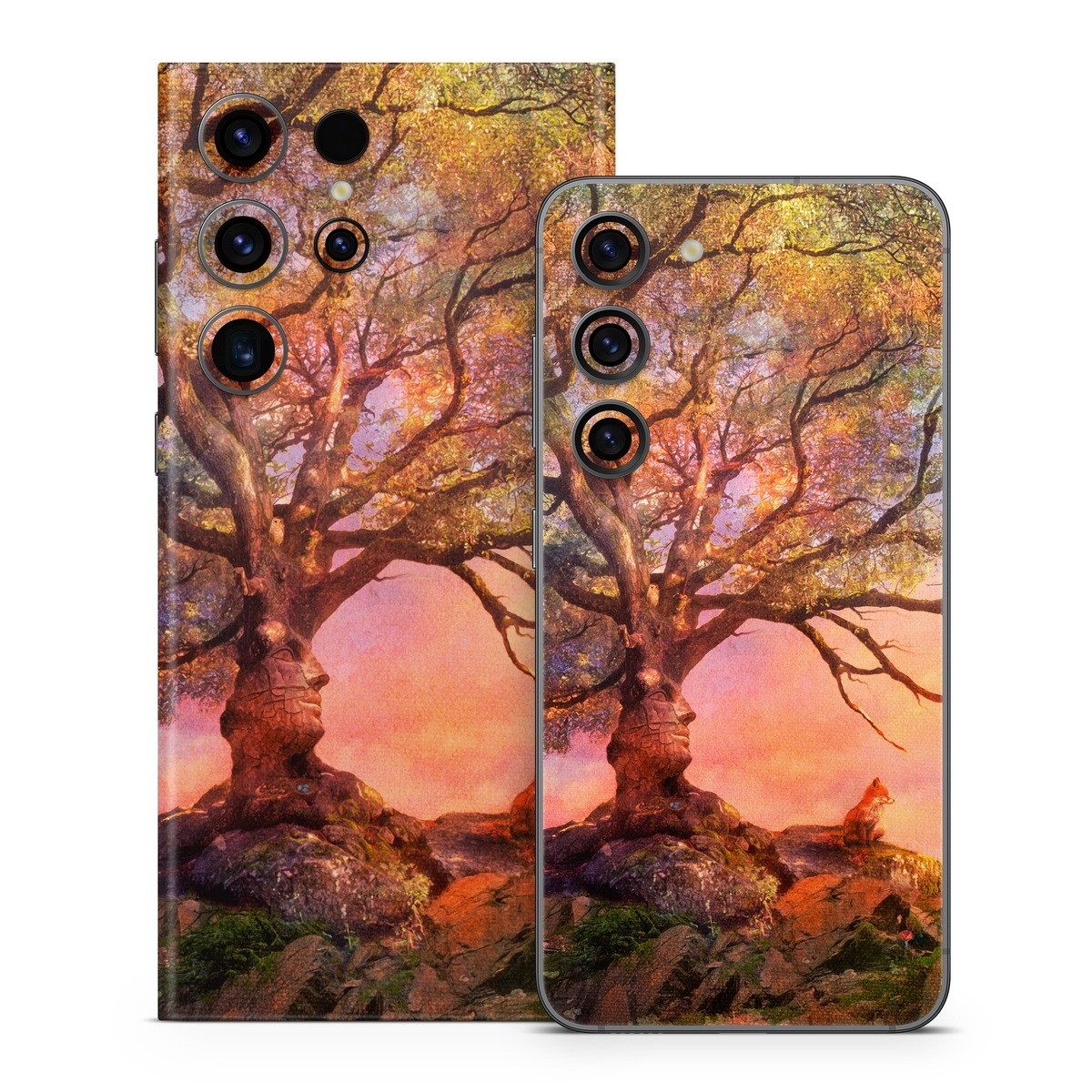 iStyles Samsung Galaxy S23 Series Skin design of Nature, Tree, Sky, Natural landscape, Branch, Leaf, Woody plant, Trunk, Landscape, Plant, with pink, red, black, green, gray, orange colors, and tagged with fineart, animals, fantasy, nature.