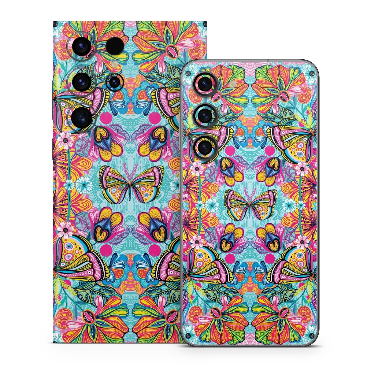 iStyles Samsung Galaxy S23 Series Skin design of Pattern, Design, Textile, Psychedelic art, Visual arts, Symmetry, Art, Motif, with blue, pink, green, yellow, orange, purple colors, and tagged with patterns, flowers, animals, bright, butterfly, carpintos, colorful, flowers, pastels, pattern, spring, summer.