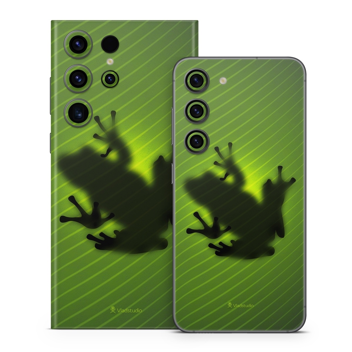 iStyles Samsung Galaxy S23 Series Skin design of Green, Frog, Tree frog, Amphibian, Shadow, Silhouette, Macro photography, Illustration, with green, black colors, and tagged with animals.