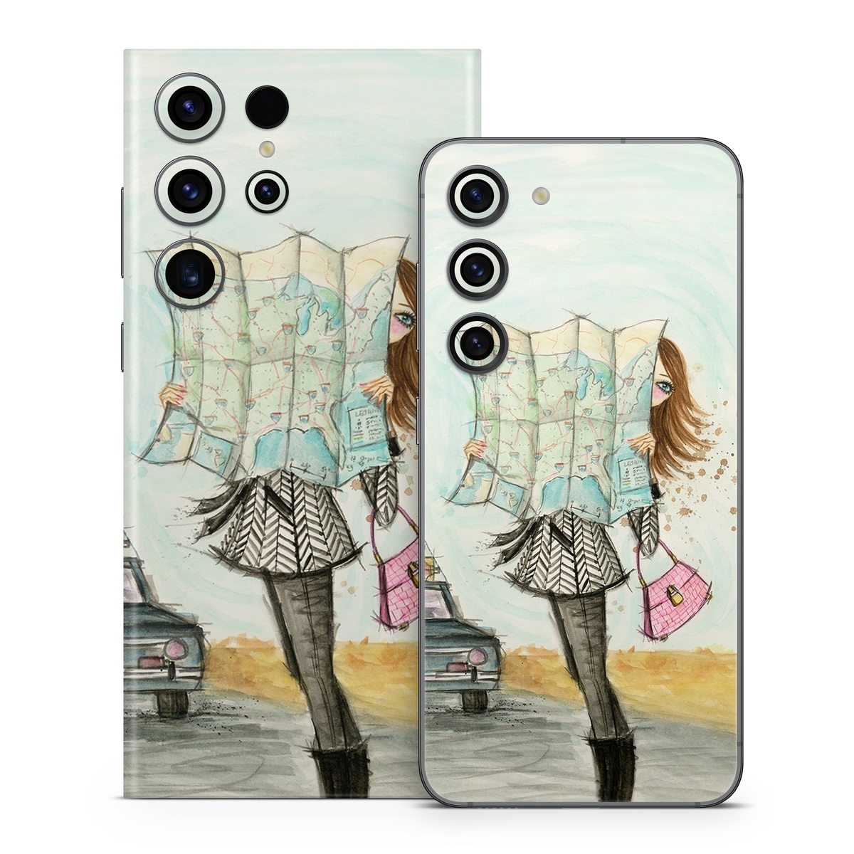 iStyles Samsung Galaxy S23 Series Skin design of Fashion illustration, Sketch, Watercolor paint, Illustration, Drawing, Art, Footwear, Vehicle, Painting, Fashion design, with blue, black, gray, white, pink, brown, green, orange, yellow colors, and tagged with people, fineart, objects, fashion, maps, adventure, driving, fashion, map, roadtrip.