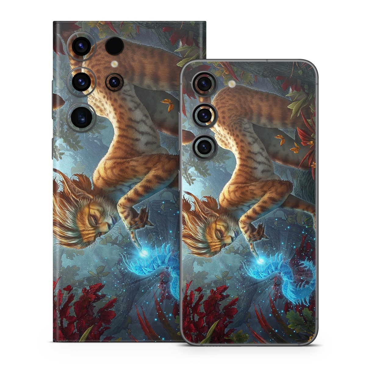 iStyles Samsung Galaxy S23 Series Skin design of Fictional character, Mythology, Illustration, Cg artwork, Sky, Organism, Dragon, Felidae, Mythical creature, Art, with yellow, red, black, green, blue colors, and tagged with fantasy, animals, patterns, people, nature, cat, fantasy, forest, nature, woman.