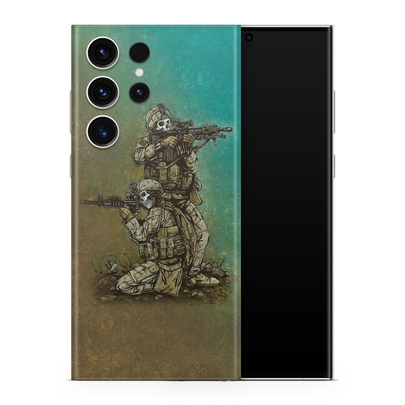 iStyles Samsung Galaxy S23 Series Skin design of Art, Sculpture, Landscape, Illustration, Visual arts, Wood, Drawing, Fictional character, Soil, Circle, with blue, green, white, gray, brown colors, and tagged with skulls, military, objects, military, guns, buddy.