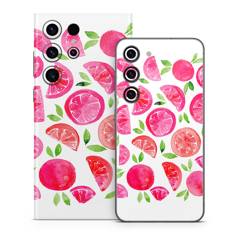 iStyles Samsung Galaxy S23 Series Skin design of Food, Plant, Fruit, Botany, Natural foods, Seedless fruit, Ingredient, Red, Font, Citrus, with pink, green, red, white colors, and tagged with patterns, objects, fruit, citrus.
