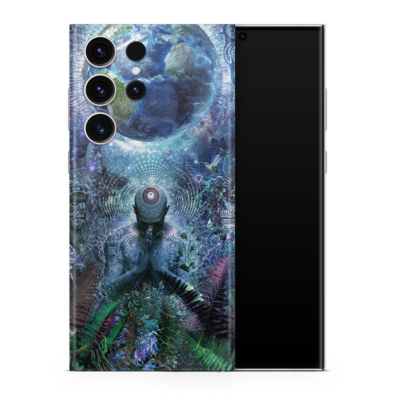 iStyles Samsung Galaxy S23 Series Skin design of Psychedelic art, Fractal art, Art, Space, Organism, Earth, Sphere, Graphic design, Circle, Graphics, with blue, green, gray, purple, pink, black, white colors, and tagged with people, fantasy, space, signs, dmt, fantasy, gratitude, indian, jungle, love, lsd, nativeamerican, nature, peace, plants, ritual, scifi, skulls, space, spirits, spiritual, symbols, trippy, world, worldpeace.
