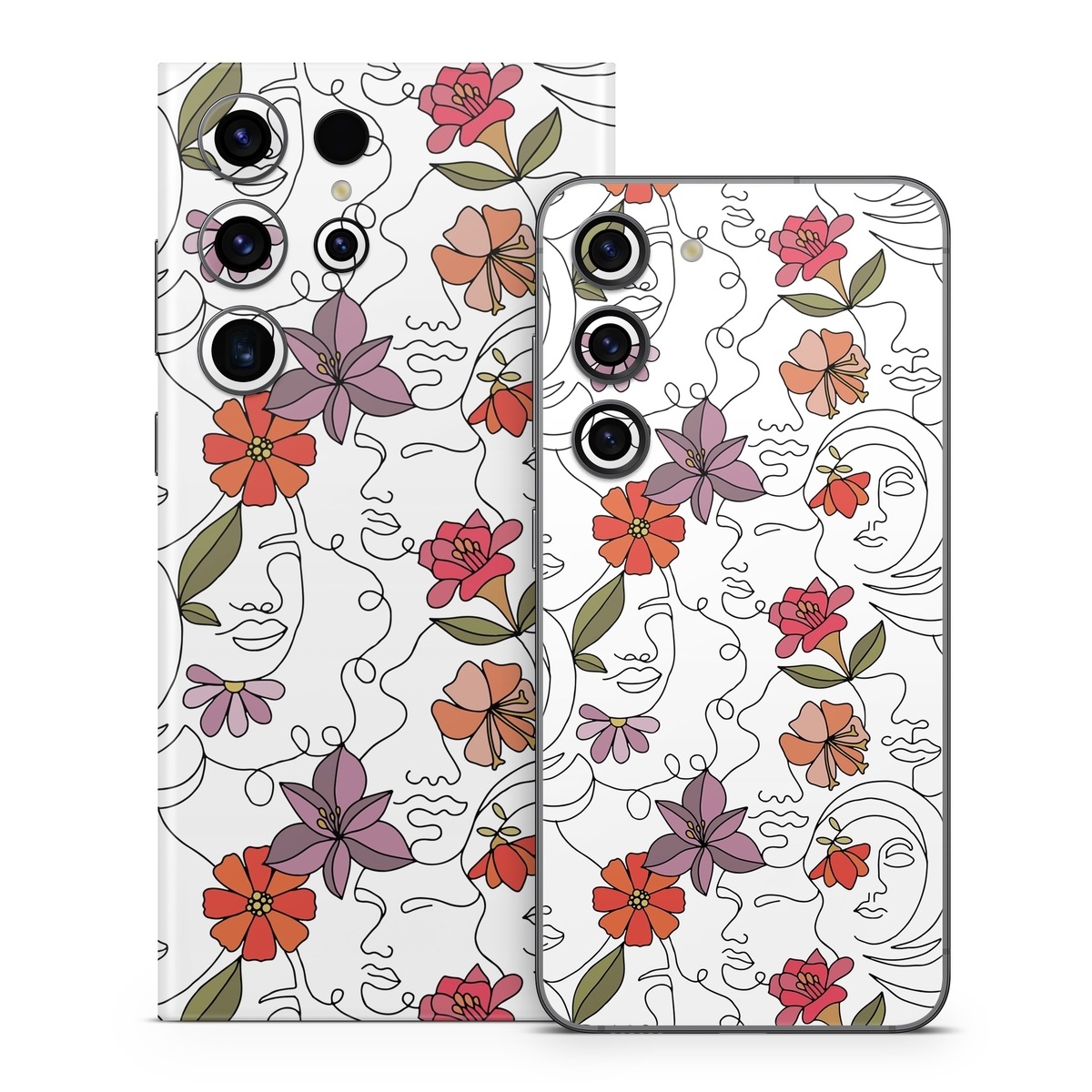 iStyles Samsung Galaxy S23 Series Skin design of Flower, Plant, White, Product, Petal, Branch, Rectangle, Botany, Textile, Creative arts, with white, red, purple, green, orange colors, and tagged with patterns, flowers, people, drawing, flowers, outline, pattern, women.