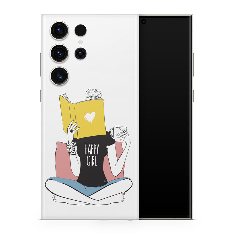 iStyles Samsung Galaxy S23 Series Skin design of White, Sleeve, Gesture, Cartoon, Comfort, Elbow, Font, Graphics, Knee, Art, with white, black, blue, pink, yellow colors, and tagged with objects, people, signs, hearts, reading, happy, cup, coffee, girl.