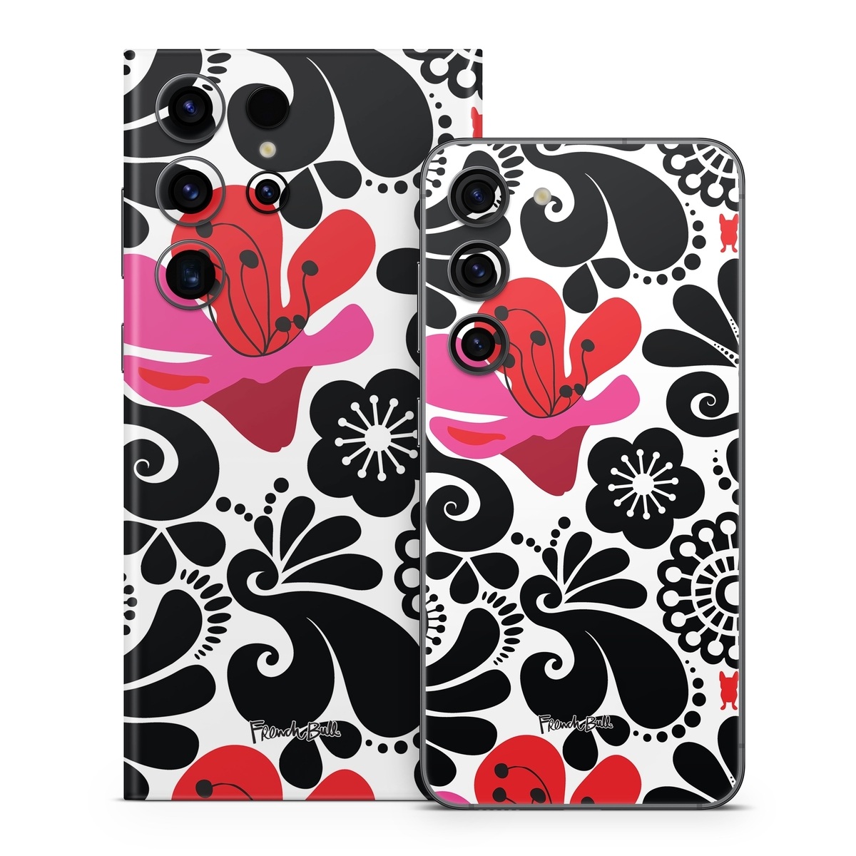 iStyles Samsung Galaxy S23 Series Skin design of White, Product, Green, Botany, Petal, Textile, Pink, Creative arts, Line, Magenta, with black, white, pink, red colors, and tagged with patterns, flowers, black, blackandwhite, floral, flower, flowers, paisley, white.