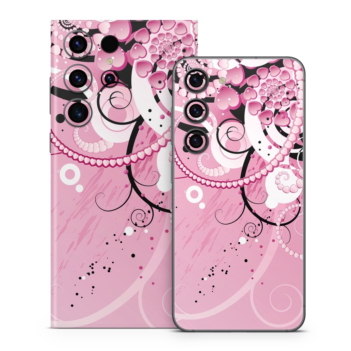 iStyles Samsung Galaxy S23 Series Skin design of Pink, Floral design, Graphic design, Text, Design, Flower Arranging, Pattern, Illustration, Flower, Floristry, with pink, gray, black, white, purple, red colors, and tagged with abstract, hearts.