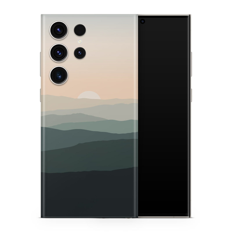 iStyles Samsung Galaxy S23 Series Skin design of Sky, Mountain, Afterglow, Cloud, Highland, Dusk, Sunrise, Landscape, Sunset, Cumulus, with black, gray, white, orange, yellow colors, and tagged with nature, sunset, landscape, mountains, horizon.