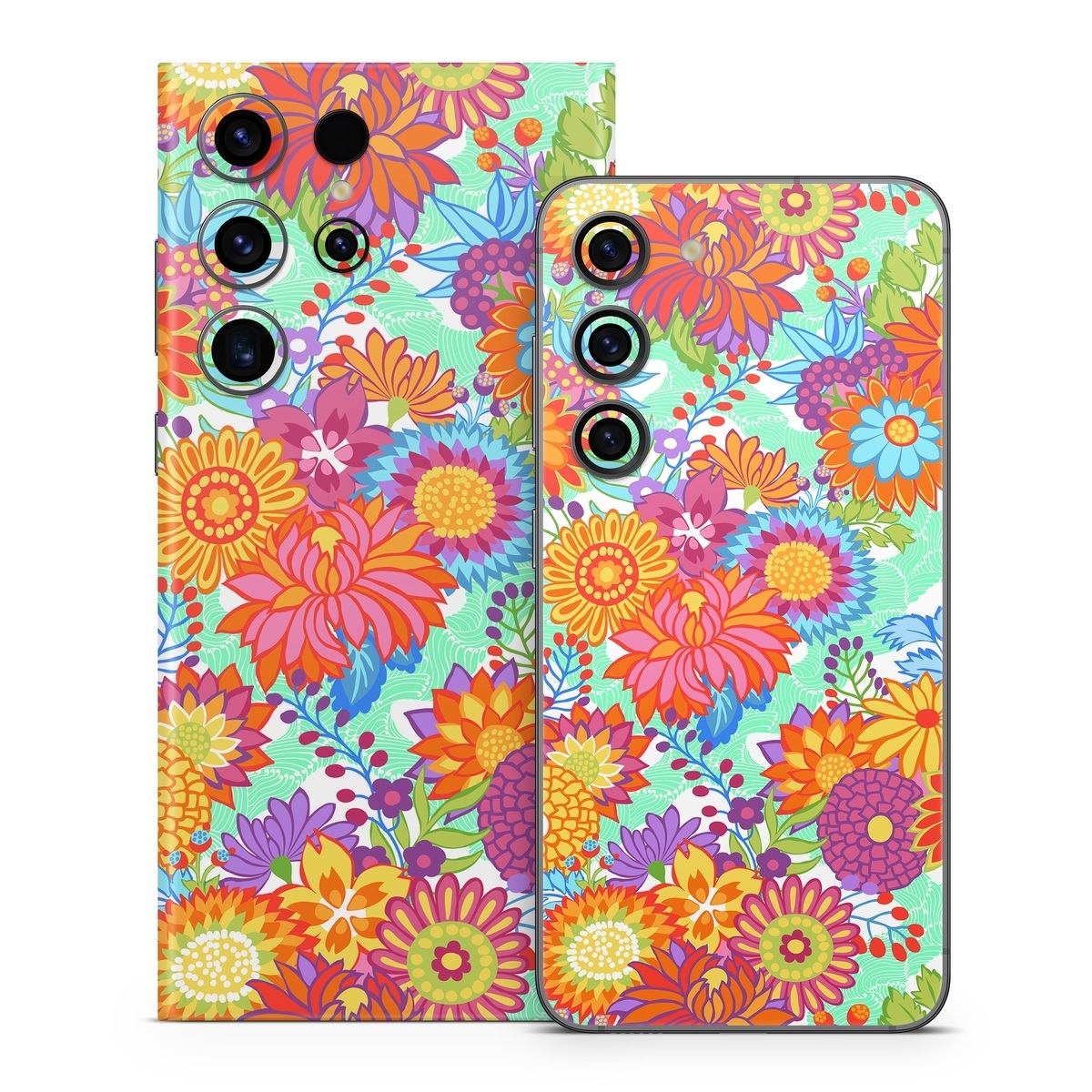 iStyles Samsung Galaxy S23 Series Skin design of Pattern, Floral design, Orange, Flower, Design, Textile, Plant, Wildflower, Wrapping paper, Visual arts, with gray, orange, green, purple colors, and tagged with patterns, flowers, bright, carnival, floral, flowers, fuchsia, green, orange, pattern, pink, yellow.