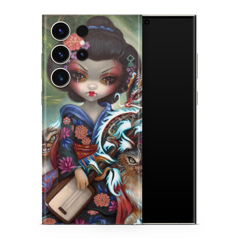 iStyles Samsung Galaxy S23 Series Skin design of Cat, Felidae, Whiskers, Illustration, Art, Small to medium-sized cats, Doll, Kitten, Norwegian forest cat, Fawn, with black, white, red, brown, blue, green, pink, purple colors, and tagged with people, animals, flowers, nature, objects, fantasy, animals, cats, fantasy, kimono.