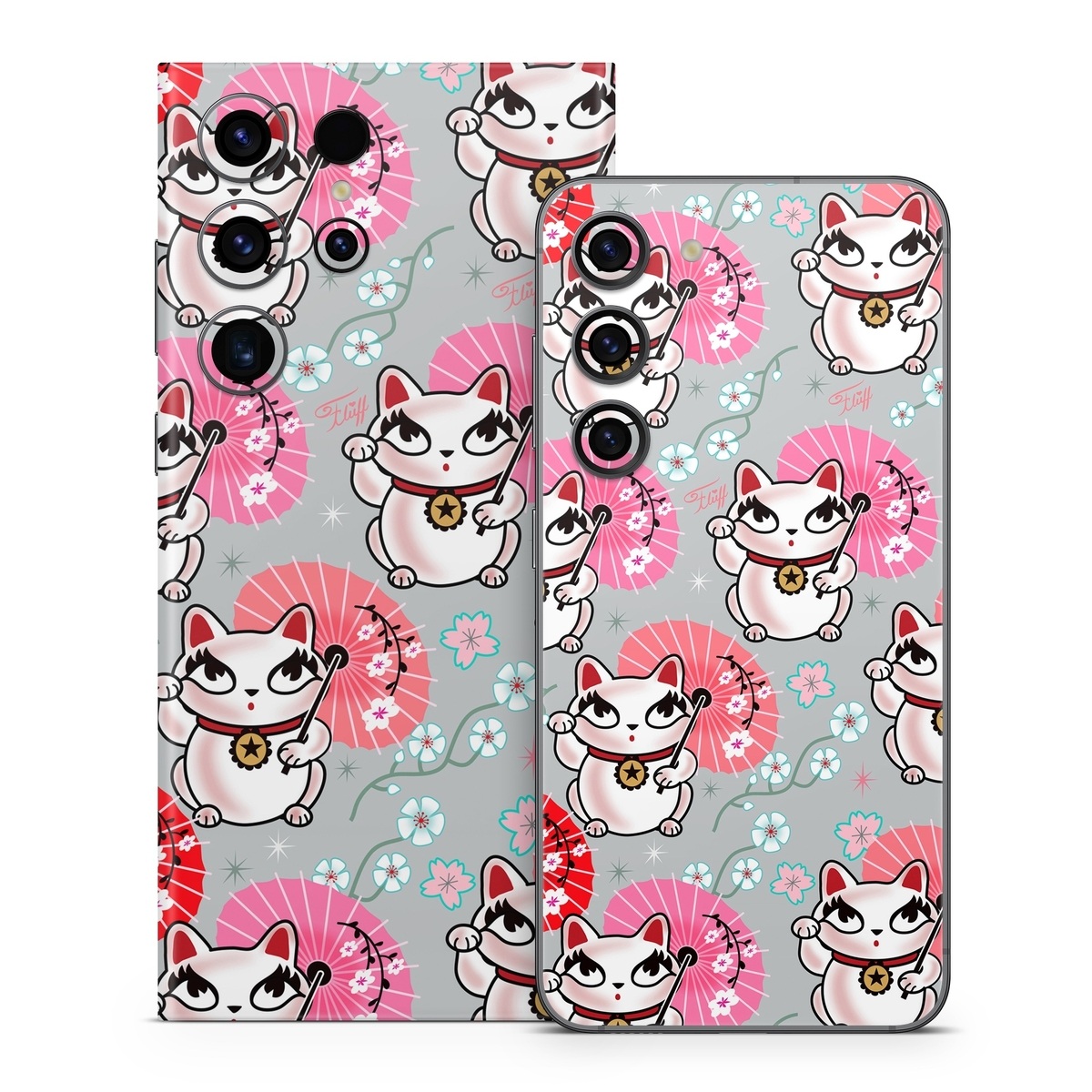 iStyles Samsung Galaxy S23 Series Skin design of Pink, Red, Cartoon, Design, Line, Textile, Pattern, Illustration, Smile, Fictional character, with white, red, pink, gray, blue, black colors, and tagged with patterns, animals, objects, cat, cats, fantasy, flower, flowers, grey, pink.