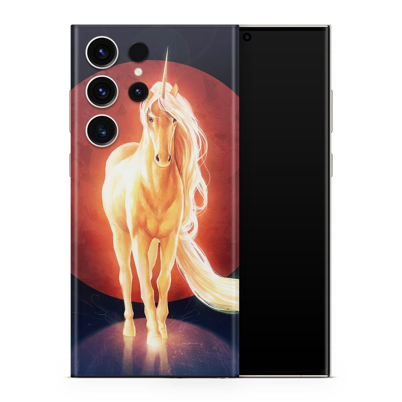 iStyles Samsung Galaxy S23 Series Skin design of Hair, Horse, Human body, Jaw, Art, Entertainment, Heat, Neon, Flame, Tail, with black, red, orange, yellow, white, purple colors, and tagged with animals, space, fantasy, glowing, moon, orange, sky, unicorn, yellow.